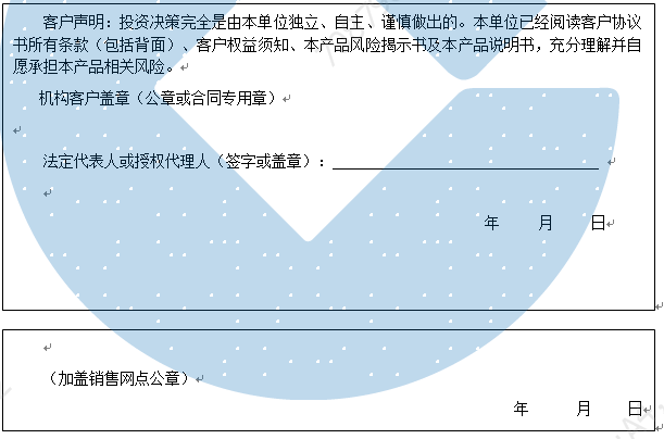 客户签名:                                    客户声明:投资决策完全是由客户独立、自主、谨慎做出的。客户已经阅读客户协议书所有条款(包括背面)、客户权益须知、本产品风险揭示书及本产品说明书,充分理解并自愿承担本产品相关风险。)