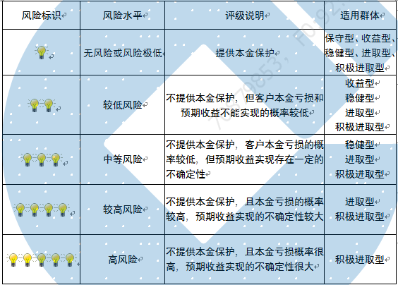 本产品内部风险评级级别为二盏警示灯 ,风险水平为较低风险。产品适合于收益型、稳健型、进取型及积极进取型客户。最不利情况下,基础资产无法回收任何本金和收益,客户将损失全部本金。客户不得使用贷款、发行债券等筹集的非自有资金投资本产品。
