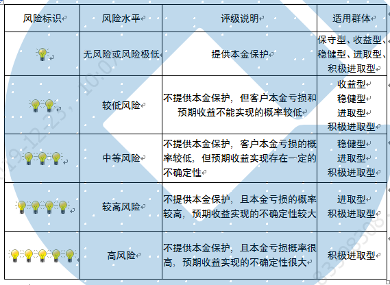 本期产品内部风险评级级别为三盏警示灯,风险水平属于中等风险。产品适合于稳健型、进取型 、积极进取型客户。最不利情况下,基础资产无法回收任何本金和收益,客户将损失全部本金。客户不得使用贷款、发行债券等筹集的非自有资金投资本产品。
