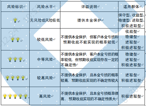 本期产品内部风险评级级别为盏警示灯,风险程度属于中等风险产品适合于稳健型、进取型及积极进取型客户。最不利情况下,基础资产无法回收任何本金和收益,客户将损失全部本金。客户不得使用贷款、发行债券等筹集的非自有资金投资本产品。