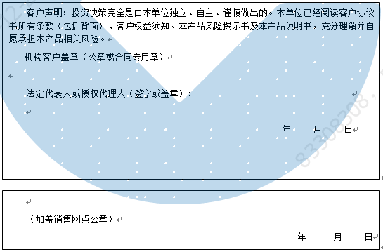 客户签名:                                    客户声明:投资决策完全是由客户独立、自主、谨慎做出的。客户已经阅读客户协议书所有条款(包括背面)、客户权益须知、本产品风险揭示书及本产品说明书,充分理解并自愿承担本产品相关风险。)