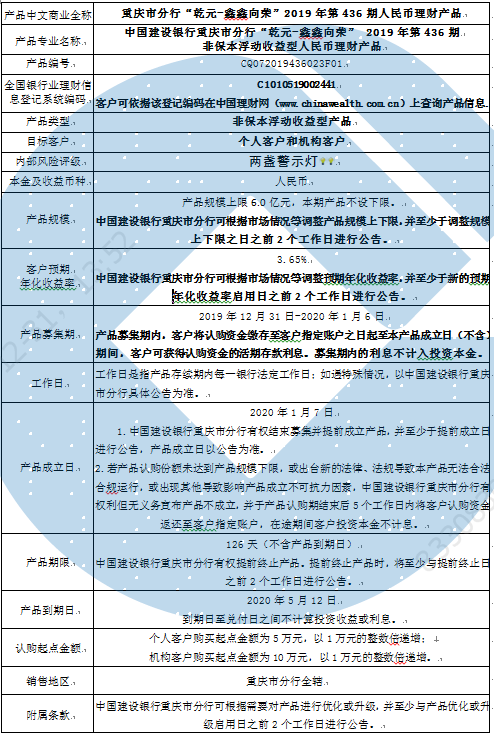1.中国建设银行重庆市分行通过中国建设银行网站(www.ccb.com)披露产品以下相关信息,包括产品成立信息,产品存续期信息,产品终止信息等。