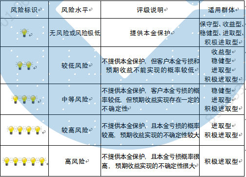 本期产品内部风险评级级别为盏警示灯,风险水平属于中等风险产品适合于稳健型进取型 积极进取型客户。最不利情况下,基础资产无法回收任何本金和收益,客户将损失全部本金。客户不得使用贷款、发行债券等筹集的非自有资金投资本产品。