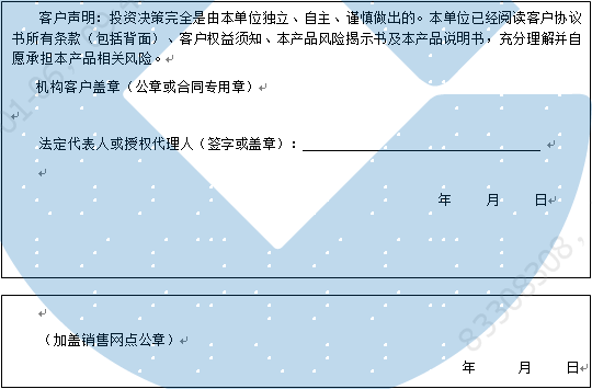 客户签名:                                    客户声明:投资决策完全是由客户独立、自主、谨慎做出的。客户已经阅读客户协议书所有条款(包括背面)、客户权益须知、本产品风险揭示书及本产品说明书,充分理解并自愿承担本产品相关风险。)