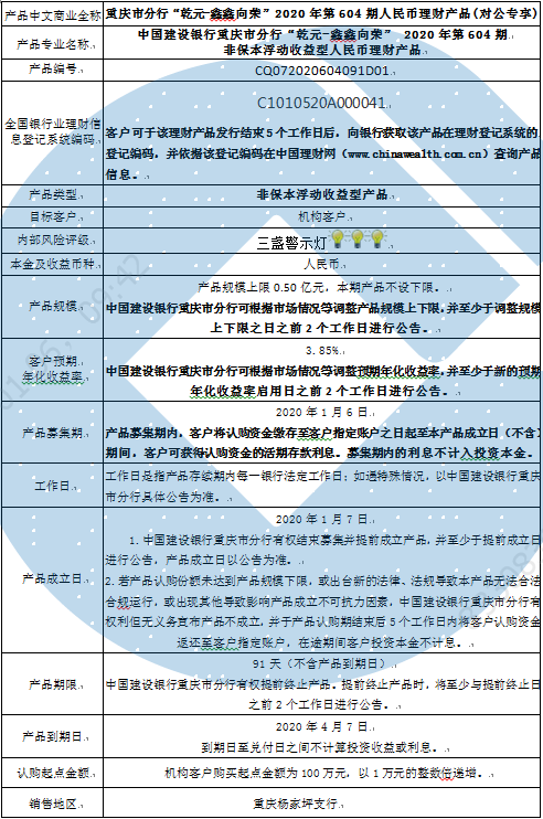 中国建设银行重庆市分行“乾元-鑫鑫向荣” 2020年第604期人民币理财产品风险揭示书和产品说明书