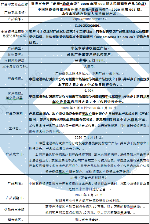 1.本期产品规模上限:6.0亿元。在本期产品募集期内,对本期产品的认购金额达到本期理财产品规模上限,则中国建设银行重庆市分行有权利但无义务停止本期产品的认购,已经认购成功的客户投资权益不受影响。