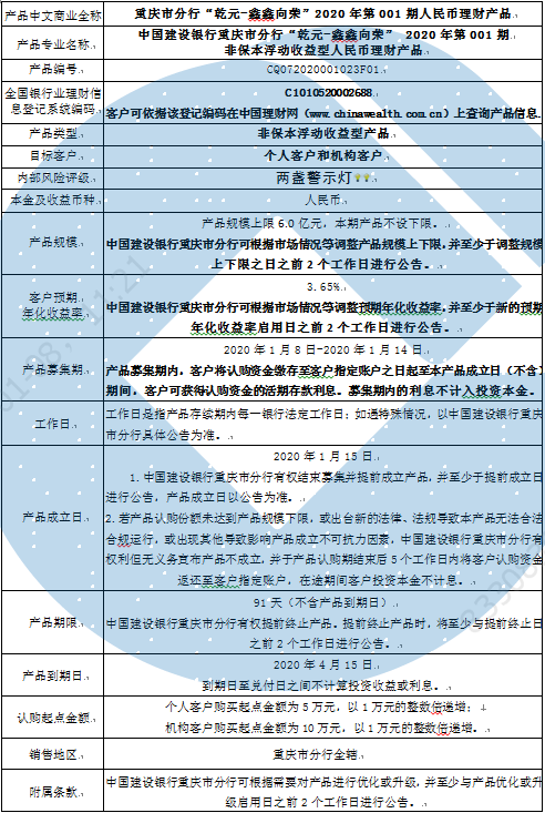 1.本期产品规模上限:6.0亿元。在本期产品募集期内,对本期产品的认购金额达到本期理财产品规模上限,则中国建设银行重庆市分行有权利但无义务停止本期产品的认购,已经认购成功的客户投资权益不受影响。