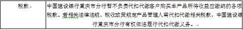 11.税收风险:中国建设银行重庆市分行暂不负责代扣代缴客户购买本产品所得收益应缴纳的各项税款。若相关税法法规规定产品管理人应代扣代缴相关税款,中国建设银行重庆市分行有权依法履行代扣代缴义务,则客户面临其取得的收益扣减相应税费的风险。此外,本产品预期年化收益率根据产品发行时现行法律法规、税收政策测算而得,税收法规的执行及修订可能对本产品投资运作等过程中需缴纳的相关税费产生影响,可能影响客户预期收益,甚至造成本金损失。
