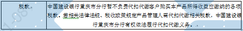 11.税收风险:中国建设银行重庆市分行暂不负责代扣代缴客户购买本产品所得收益应缴纳的各项税款。若相关税法法规规定产品管理人应代扣代缴相关税款,中国建设银行重庆市分行有权依法履行代扣代缴义务,则客户面临其取得的收益扣减相应税费的风险。此外,本产品预期年化收益率根据产品发行时现行法律法规、税收政策测算而得,税收法规的执行及修订可能对本产品投资运作等过程中需缴纳的相关税费产生影响,可能影响客户预期收益,甚至造成本金损失。