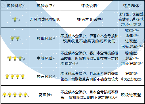本期产品内部风险评级级别为盏警示灯,风险程度属于中等风险产品适合于稳健型、进取型及积极进取型客户。最不利情况下,基础资产无法回收任何本金和收益,客户将损失全部本金。客户不得使用贷款、发行债券等筹集的非自有资金投资本产品。