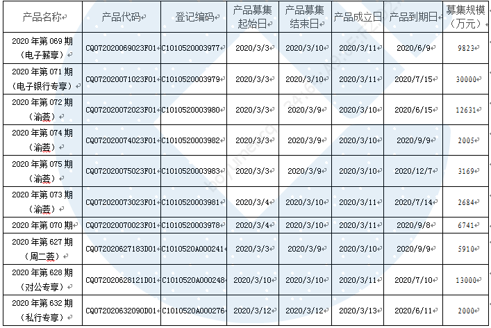 根据与投资者的约定,现将2020年3月9日-2020年3月13日期间理财产品成立情况信息进行披露: