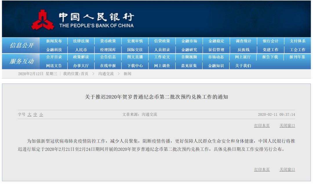 中国人民银行关于推迟2020年贺岁普通纪念币第二批次预约兑换工作的通知