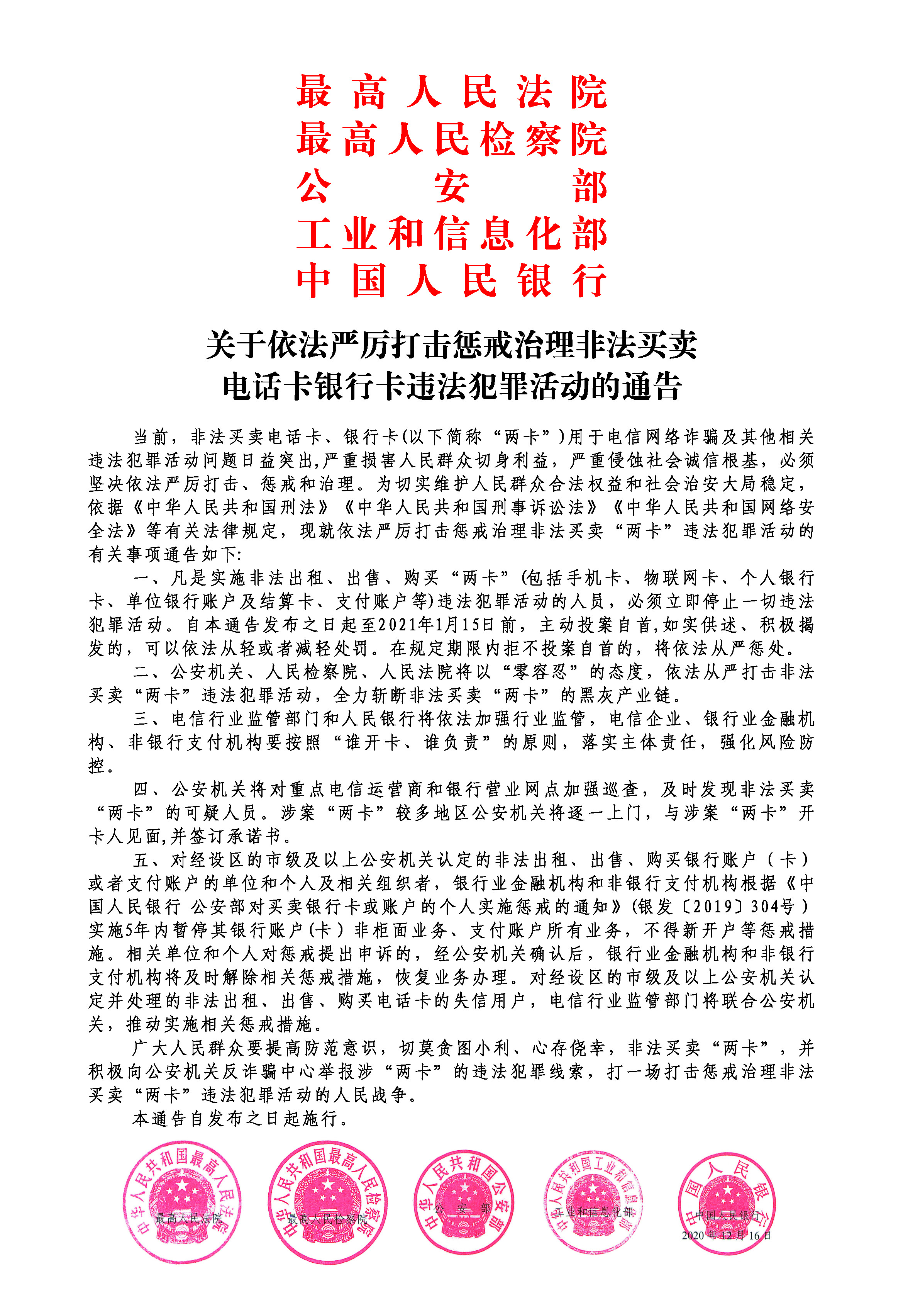关于依法严厉打击惩戒治理非法买卖电话卡银行卡违法犯罪活动的通告