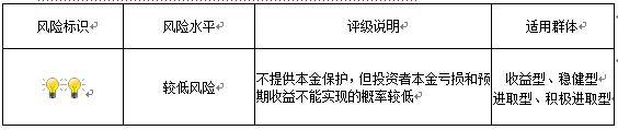 本期产品为非保本浮动收益型理财产品,不保证本金和收益,请您充分认识投资风险,谨慎投资。本期产品期限221天(中国建设银行有权对本期产品进行展期和提前终止),存续期内产品不接受申购或赎回申请。本期产品内部风险评级级别为2盏警示灯 ,风险程度属于较低风险。最不利情况下,资产组合无法回收任何本金和净收益,客户将损失全部本金。产品适合于收益型、稳健型、进取型、积极进取型客户。