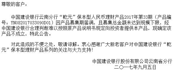 关于中国建设银行云南分行“乾元”保本型人民币理财产品2017年第33期不成立的公告