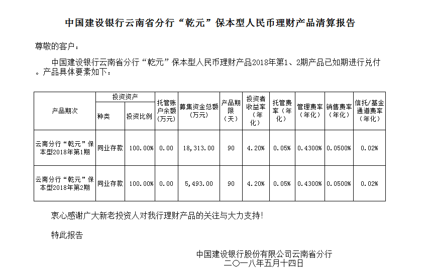云南分行乾元保本理财产品2018年第1、2期清算公告